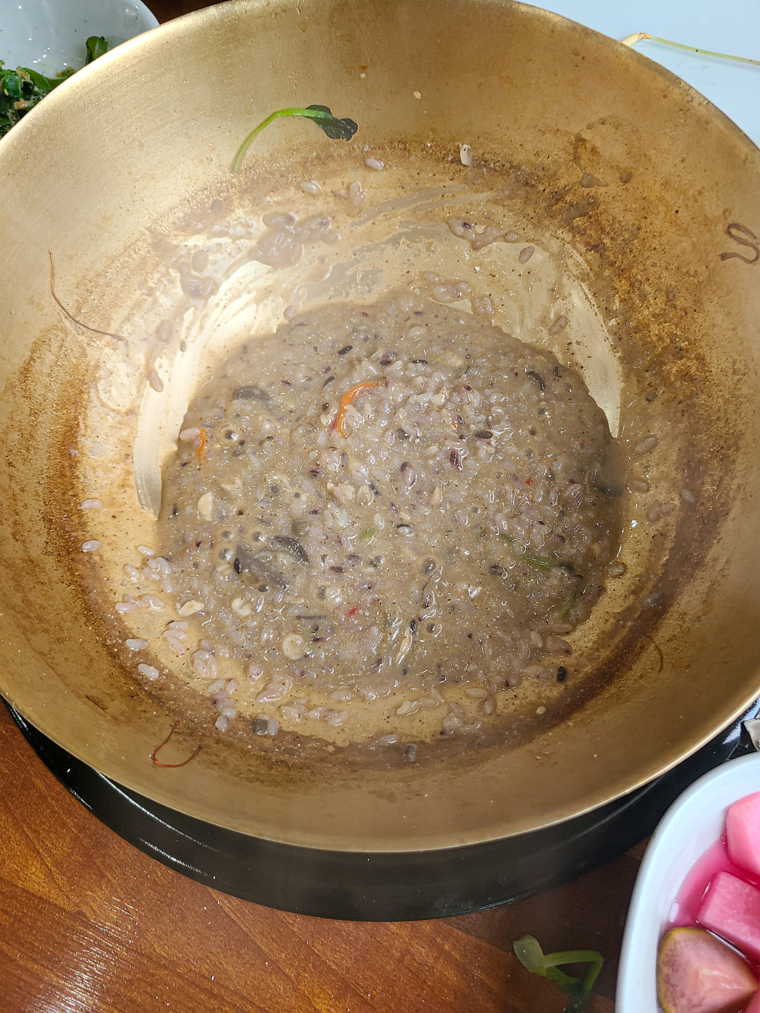 나머지 국물 덜어내고서 죽 끓여먹으면서 마무리.