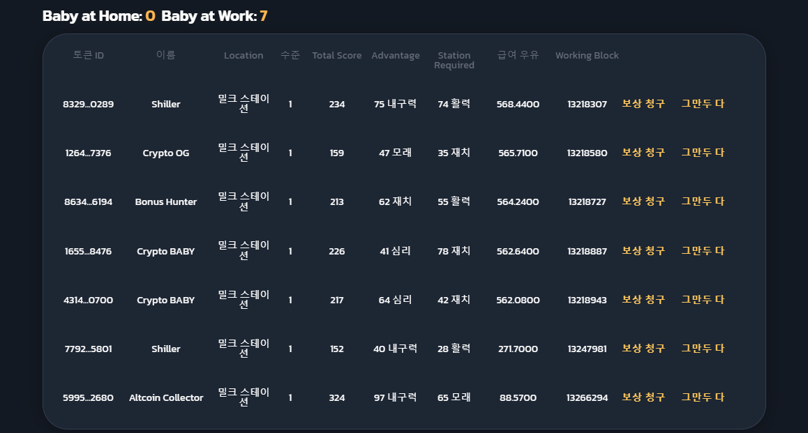 크립토유 베이비들이 채굴한 밀크는 보상 청구를 통해 획득할 수 있다.