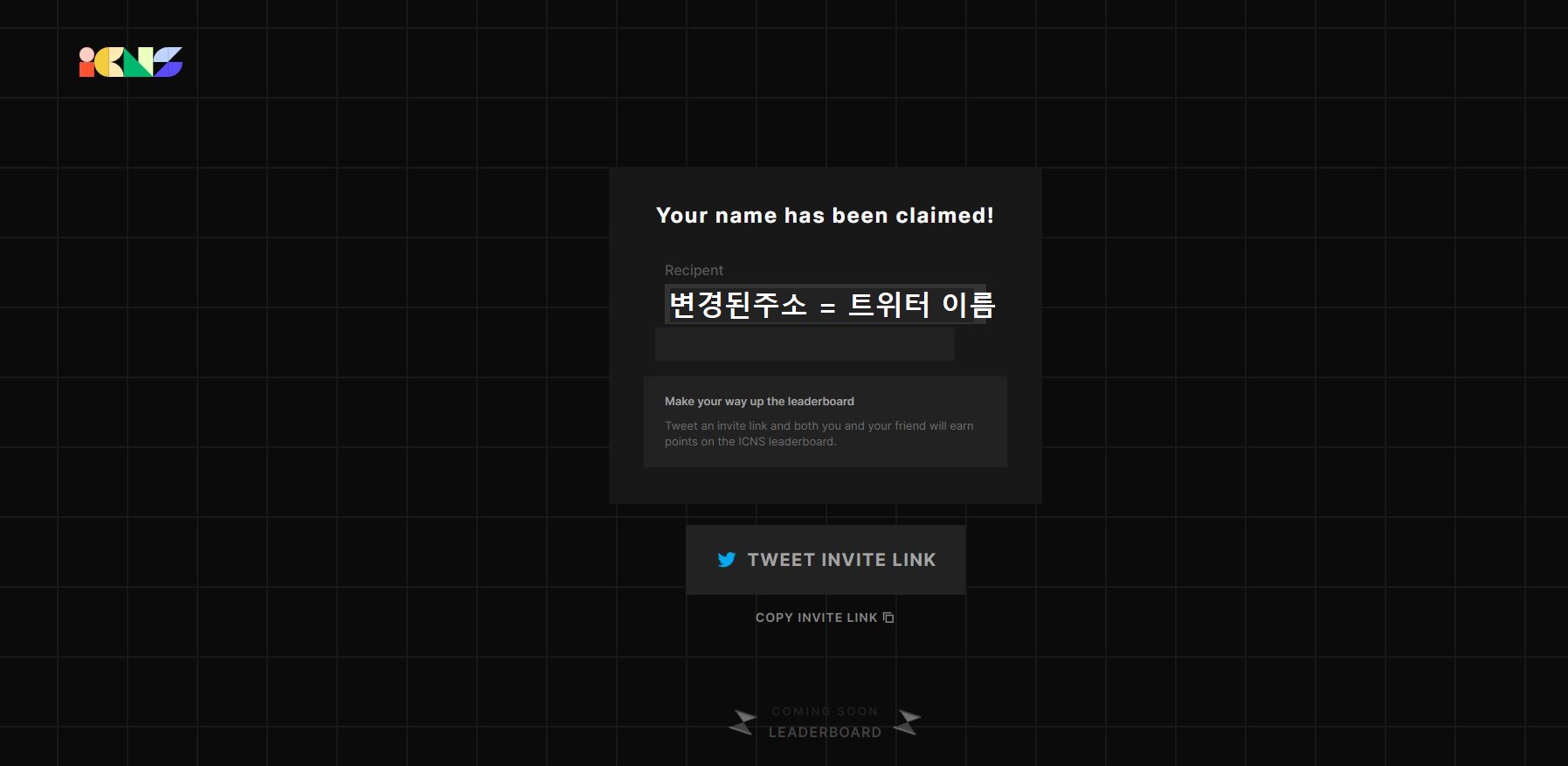 트위터 통해 ICNS만들면 해당 계정 명 블록체인에 기록되고 영구적으로 남는다,