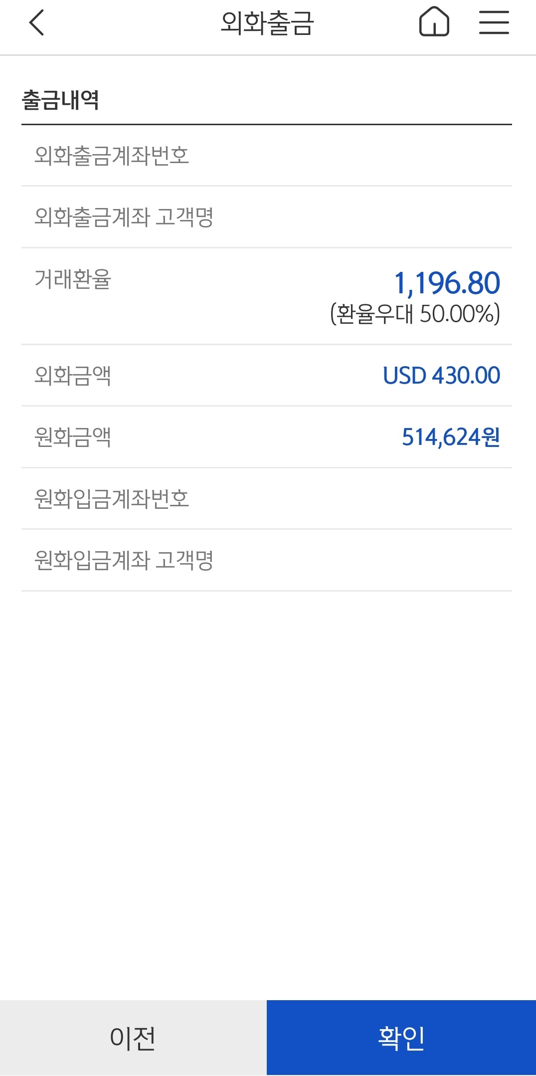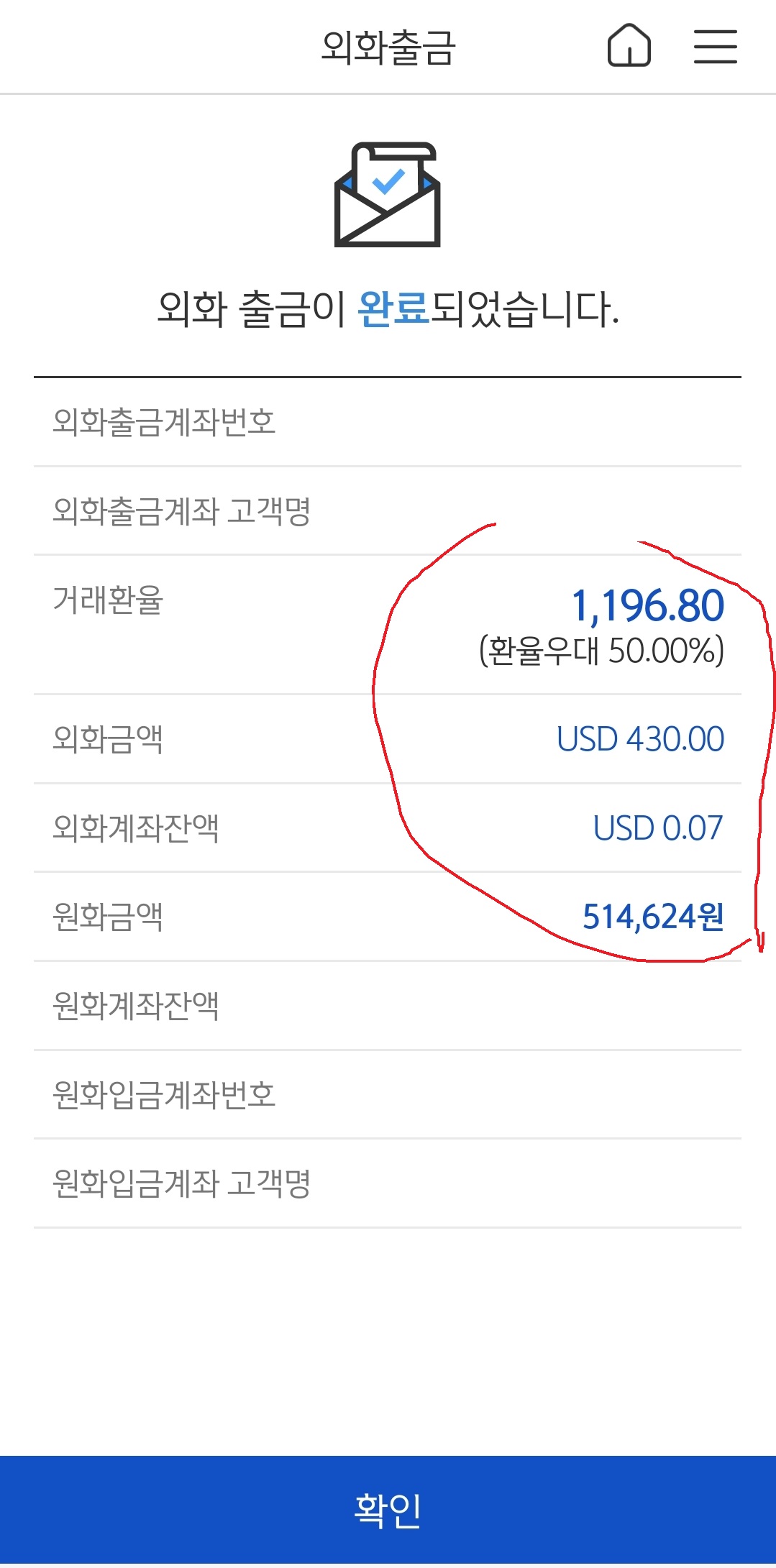 이를 모두 확인한 뒤 진행을 하면 최종적으로 외화출금(=외화환전)이 완료된다.