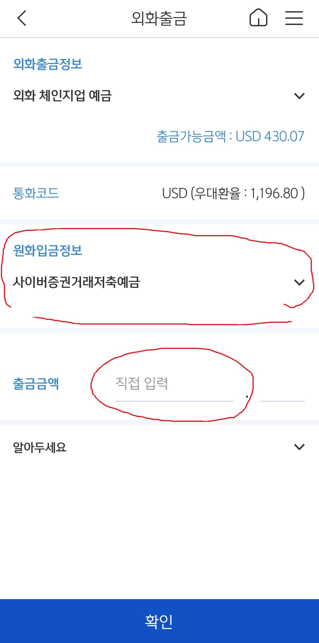 출금금액 : 원화로 환전할 달러를 입력하면 된다.