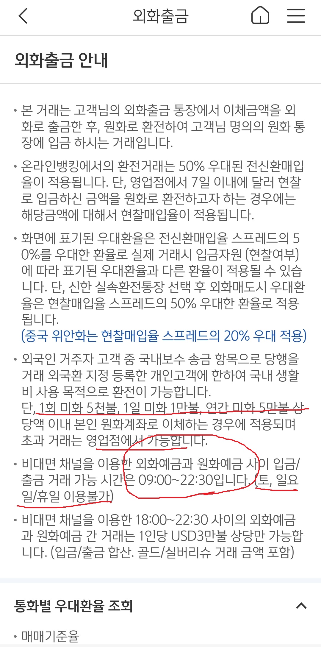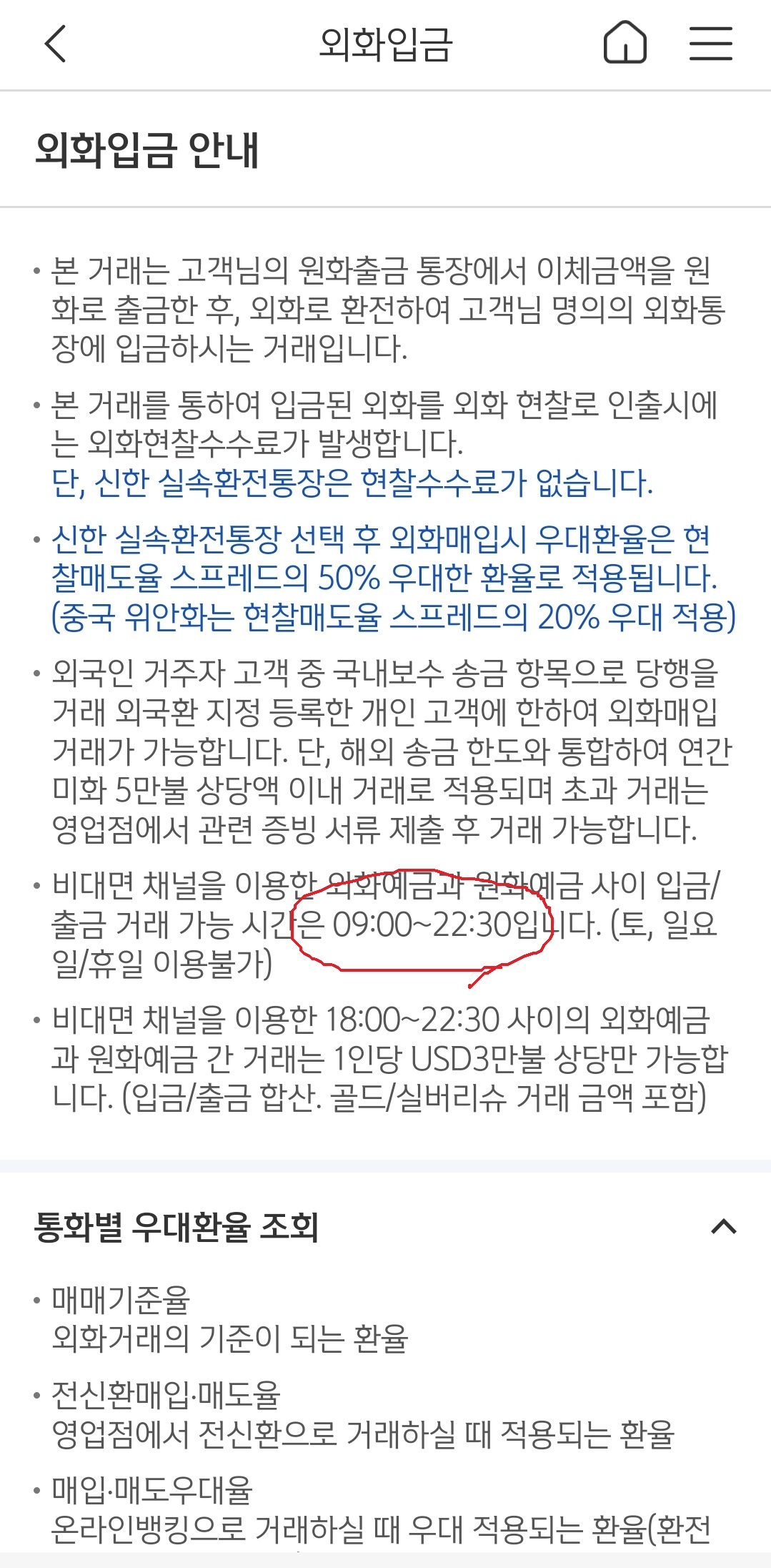 신한은행 비대면 외화출금은 09시~22시 30분까지 이용 가능하며 토, 일, 휴일은 이용 불가능하다고 하니 참고하자.