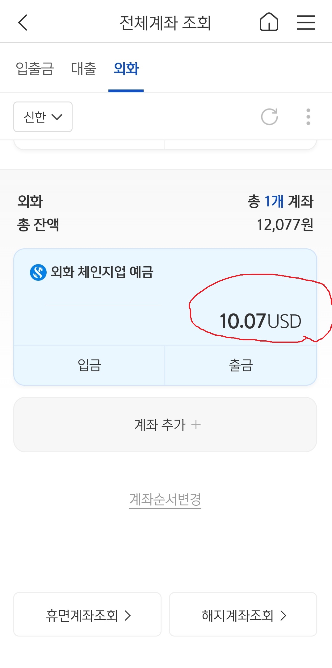 신한은행 대표어플 쏠(SOL)과 신한은행 외화계좌 외화 체인지업 예금 계좌를 보유하고 있어야한다.