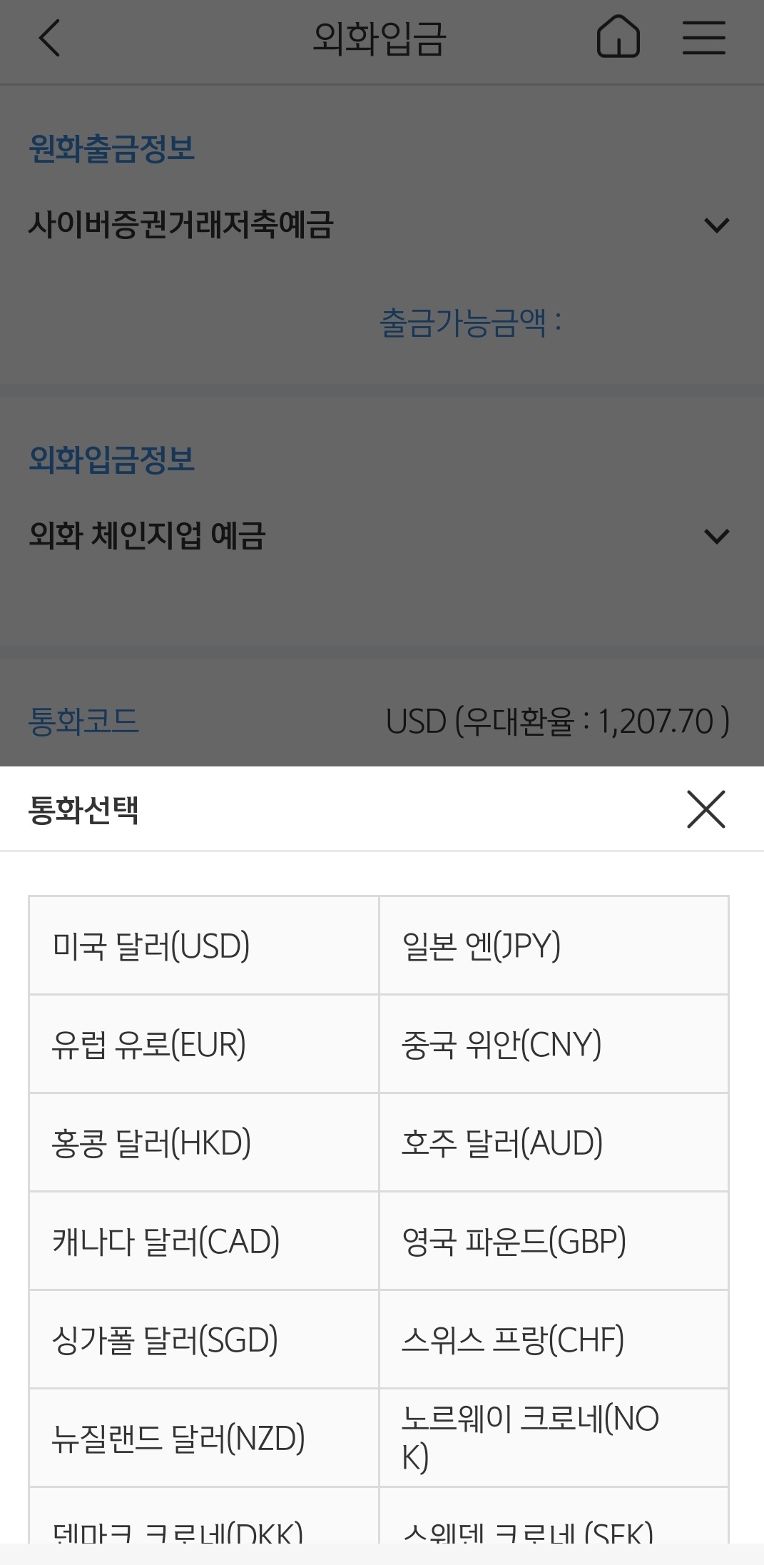 원화입금정보 : 달러 환전 후 원화를 입금받을 계좌를 선택.