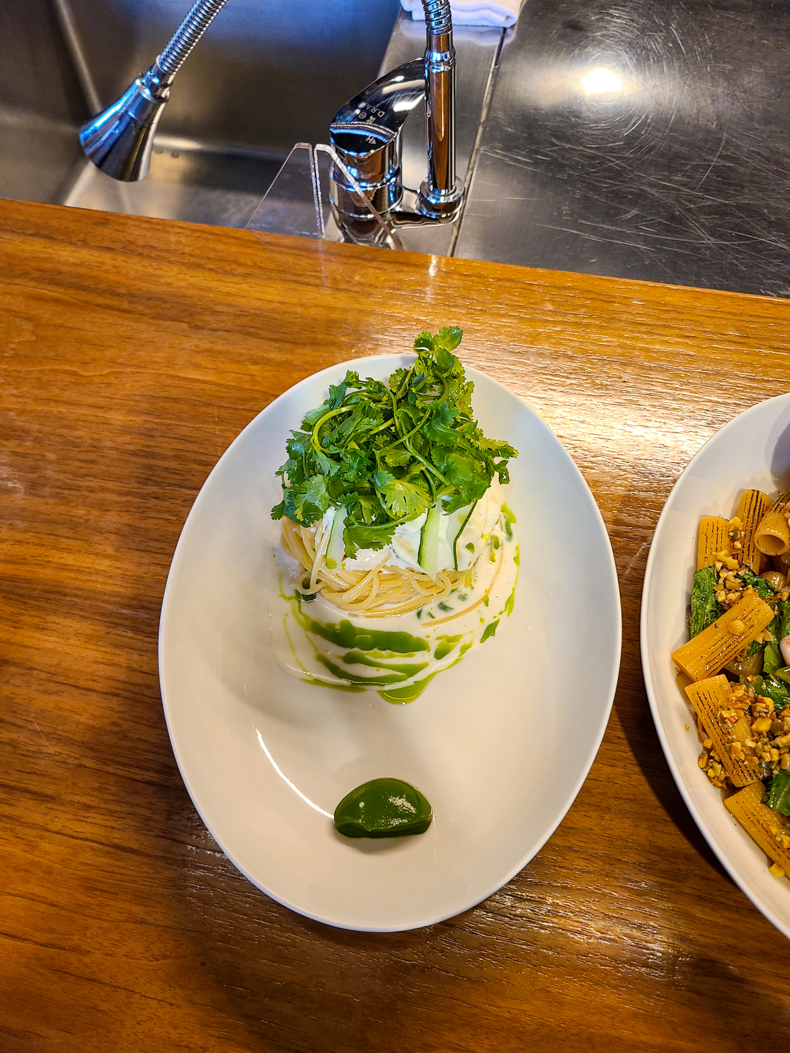 코코넛밀크 크림이 들어간 스파게티에 고수 오일과 고수잎, 그리고 고수 퓨레가 들어간 메뉴로