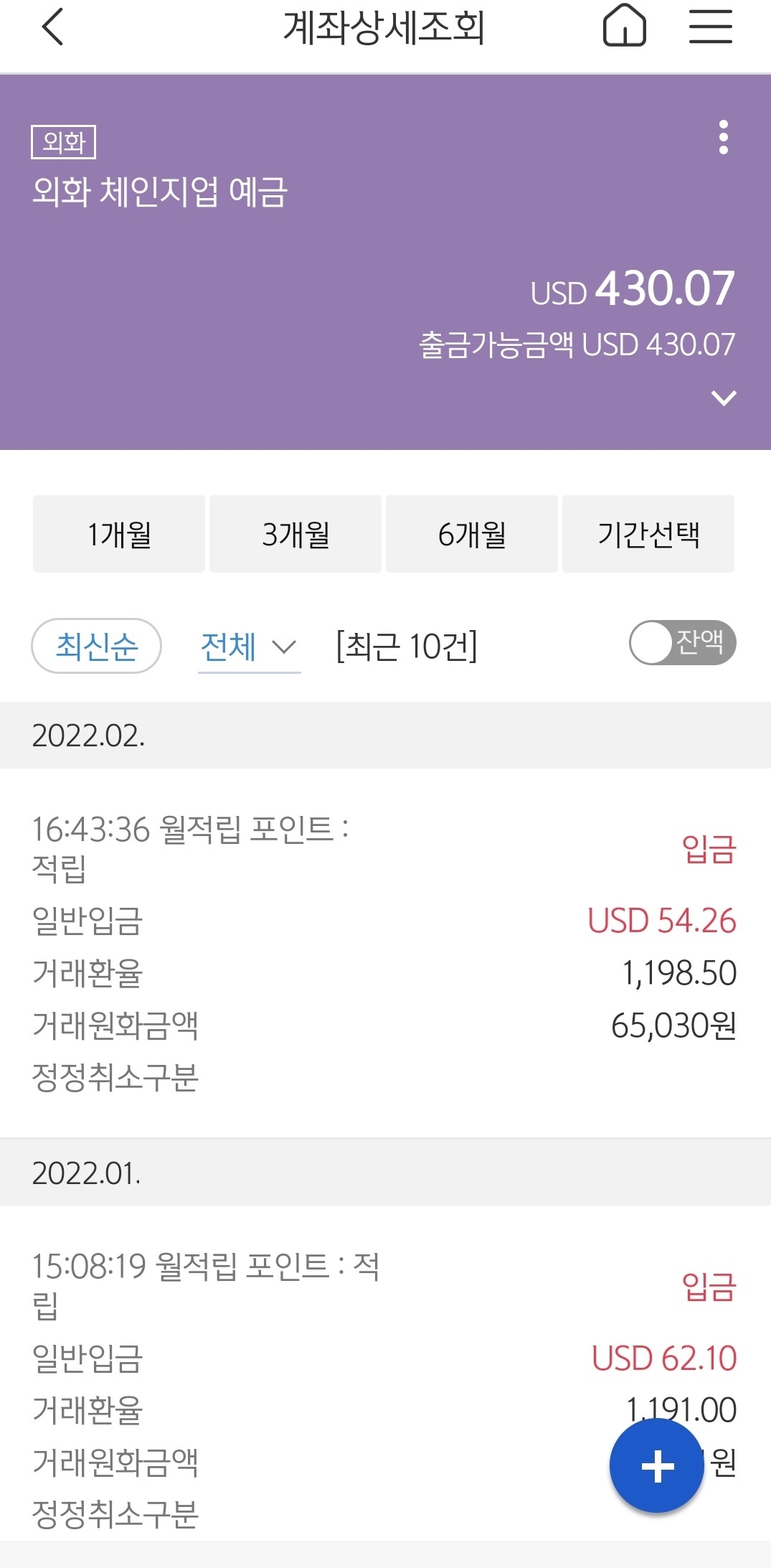 더모아 포인트로 적립된 금액은 6.5만포인트, 환율 1,198.5원으로 계산하여 54.26달러가 입금됐다.