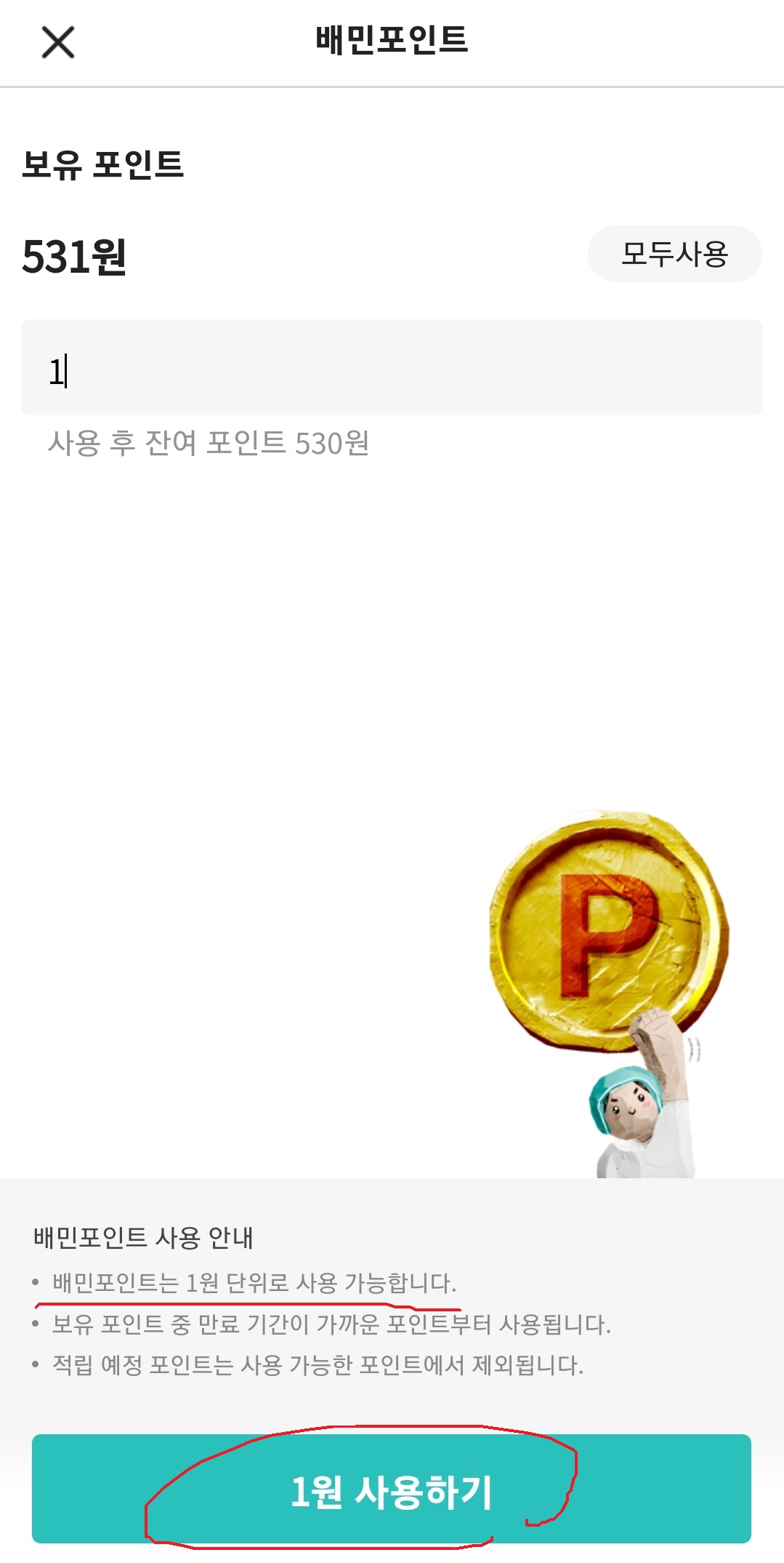 3. 1원 단위로 사용가능한 배민포인트 1원 사용으로 결제금액 xx,999원 맞추기.