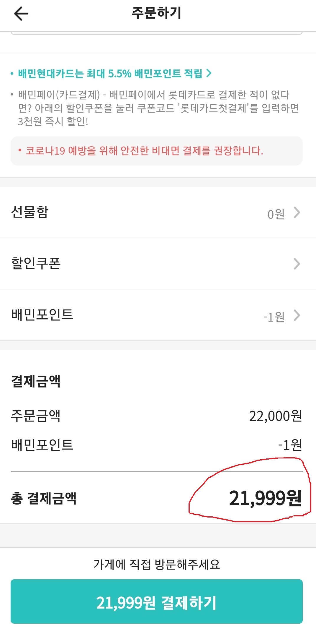 - 배달의민족 배민카드 등록 및 포인트 1원 사용으로 결제금액 999원 만들기.