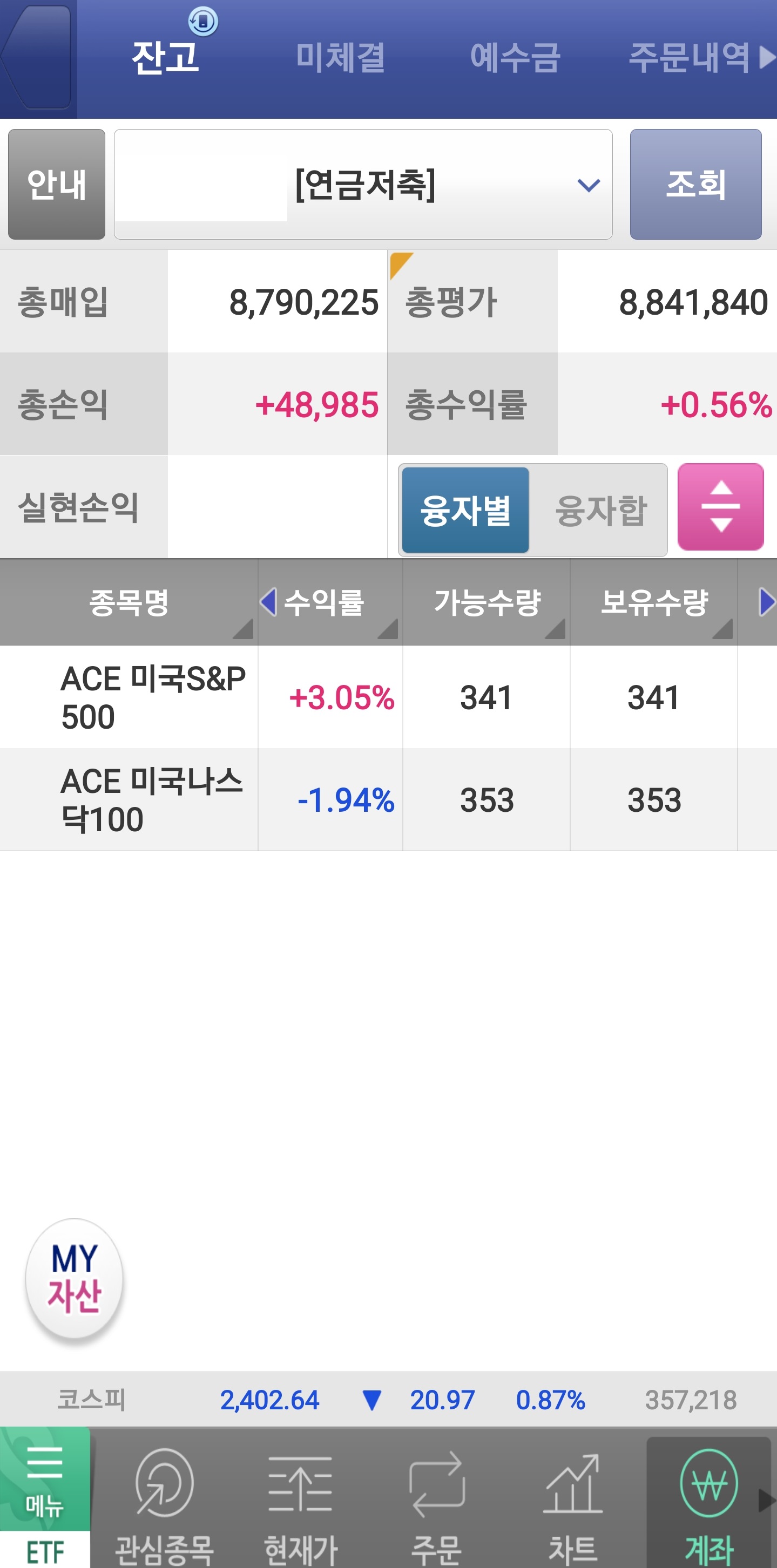 이 금액을 5:5로 나눠 ACE미국S&P500, 나스닥100을 적립식으로 매수해나가고 있다.