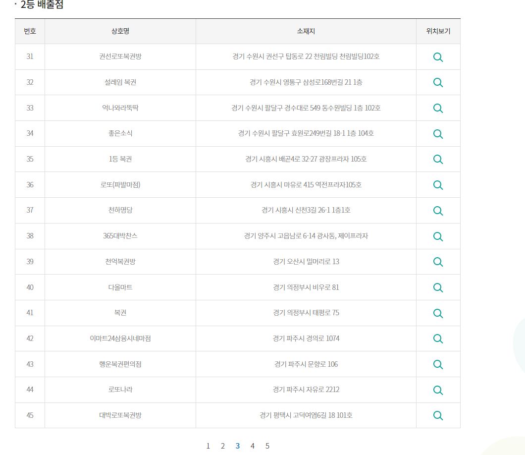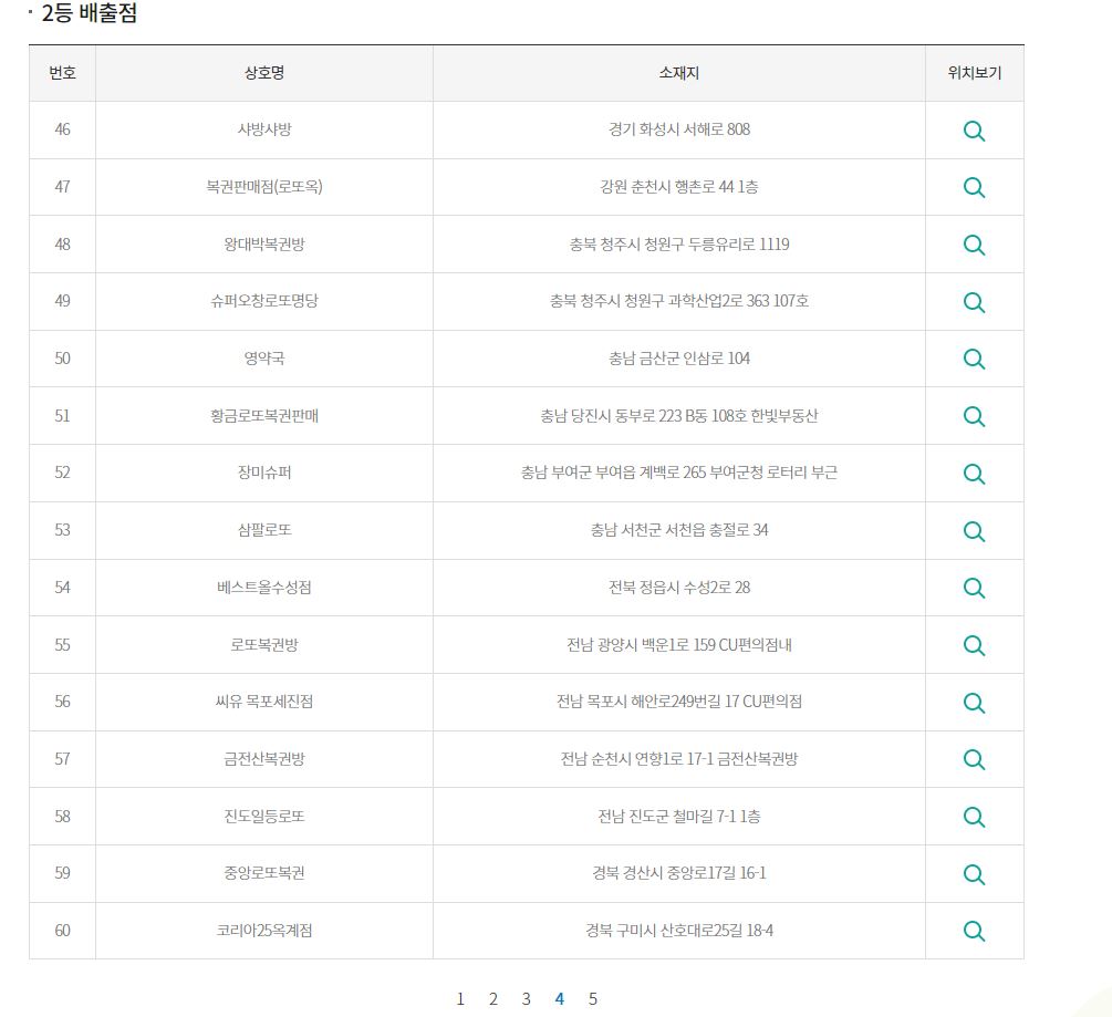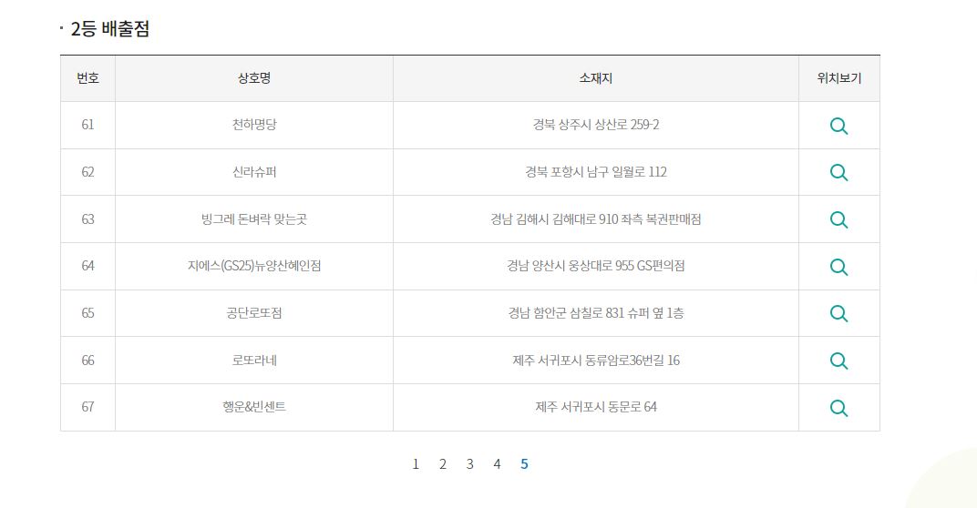 동행복권 인터넷 복권판매사이트를 시작으로 부산 중구 자갈치로 33 501, 502호 자갈치 도깨비명당, 인천 중구 신도시남로 142번길 6 1동 1층 128호 NBA(엔비에이), 광주 광산구 월계로 110 104호 백송마트, 경기 시흥시 하중로 235 법조타운103호 용꿈돼지꿈복권방, 경기 평택시 헌신3길 44 용이복권방, 경기 화성시 세자로 358 세븐일레븐화성봉담수기점, 이상 일곱 곳이다.